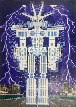 Inspired by towering skyscrapers, dense cityscapes, and pop culture influences such as Gundam robots and Yu-Gi-Oh! cards, Rocky has developed a unique illustration style. His work weaves together machinery, symbols, and bold colours to create intricate robotic characters; reflecting his perspective of feeling different in an allistic world.